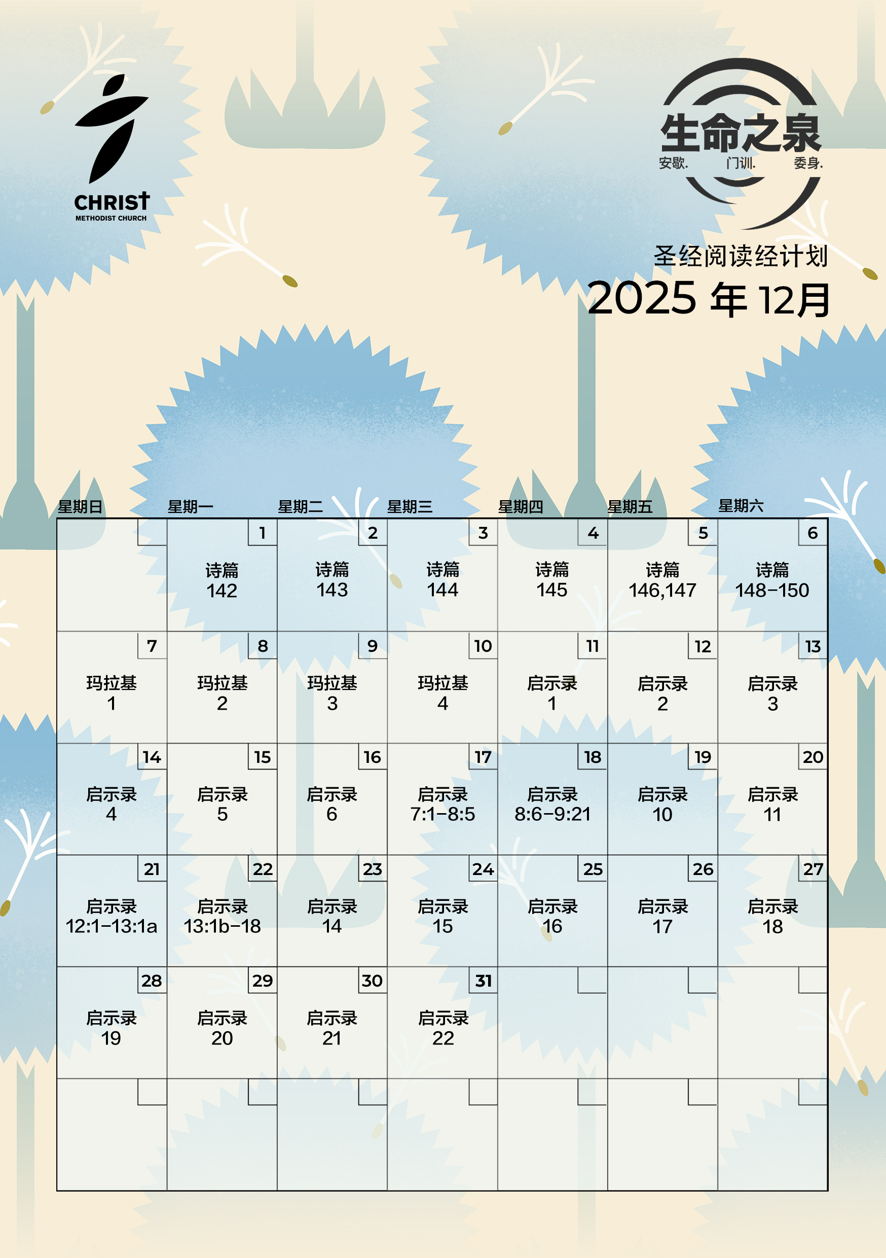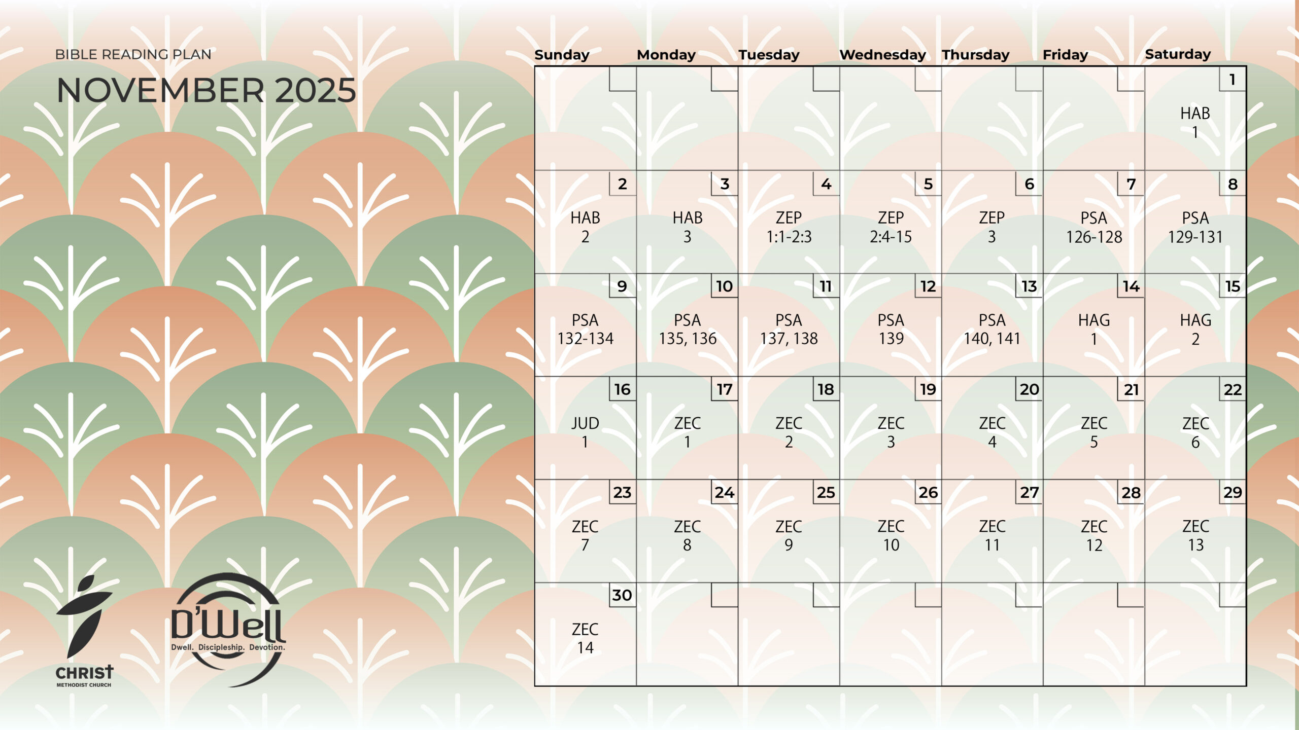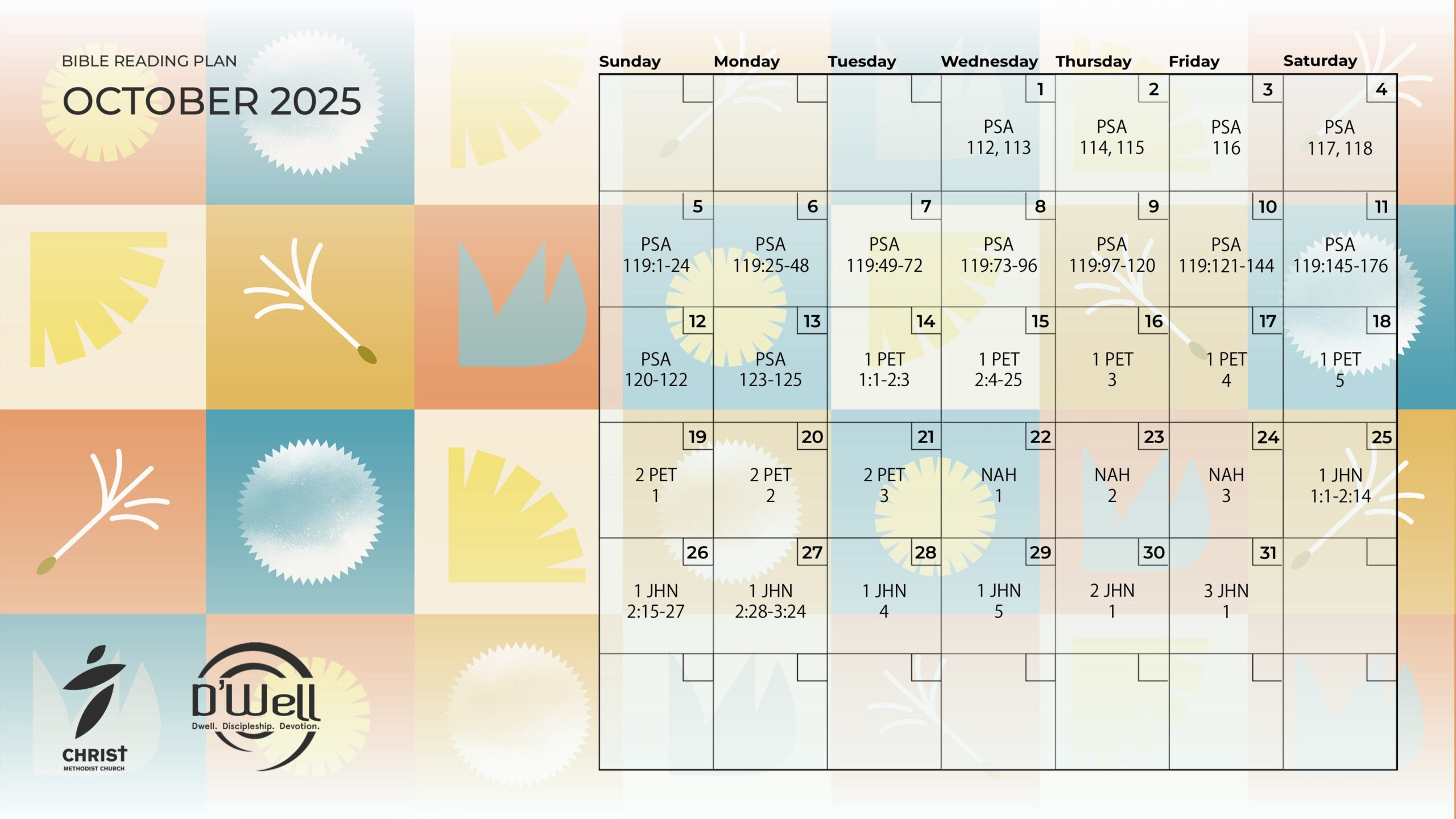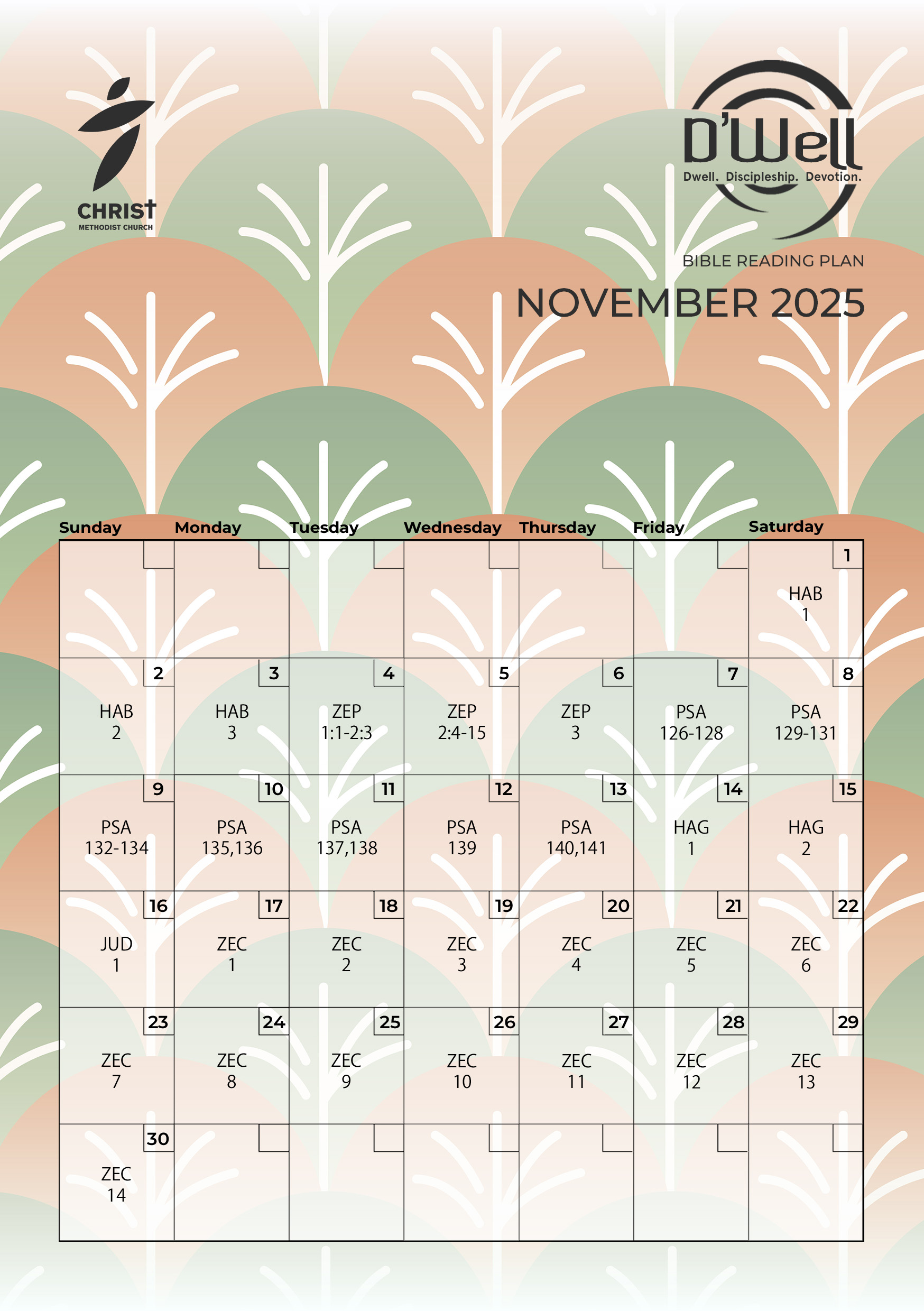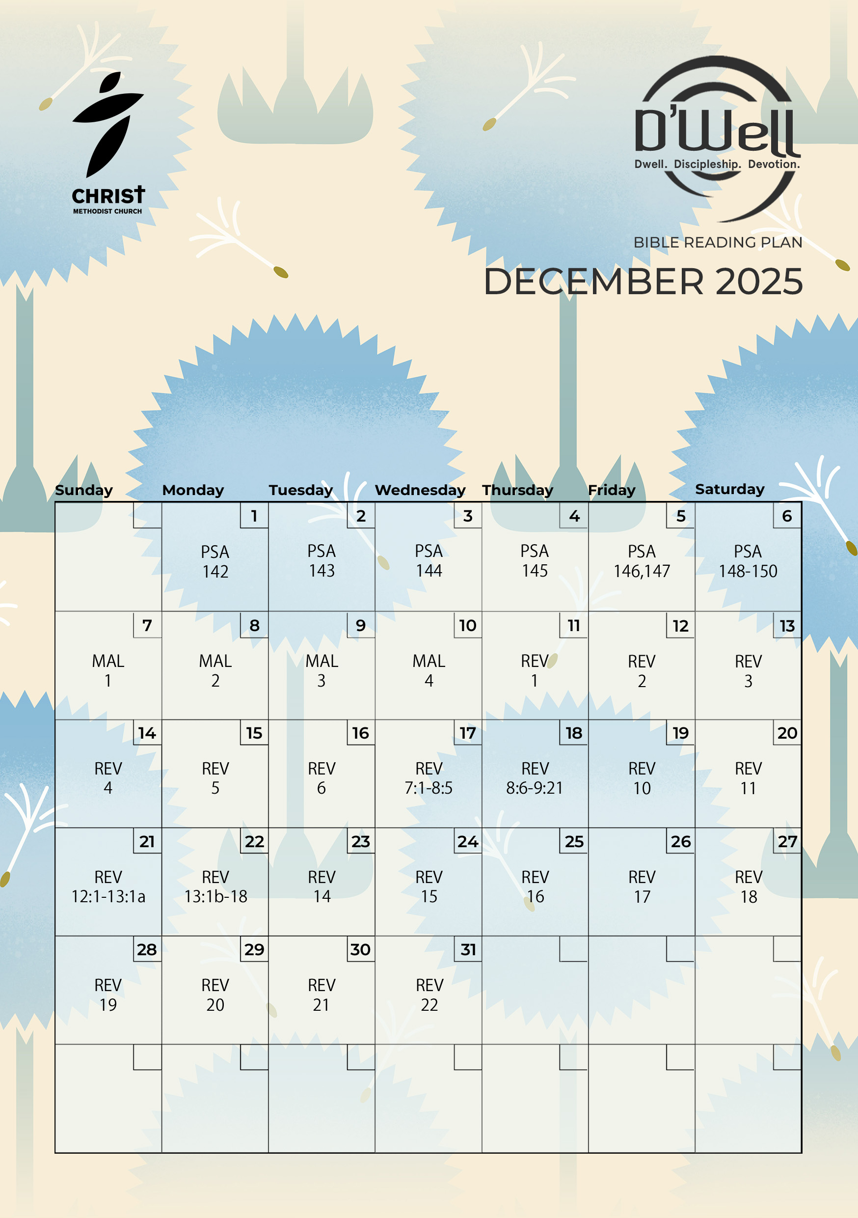 D’Well is a 4-year Bible Reading Plan (2022 – 2025) that takes readers through a Scriptural account each day, allowing for thoughtful reading, quiet meditation and reflective prayer at a deliberate pace. Books have been intentionally arranged to alternate between the Old and New Testaments, providing the reader with a wider scope into the overarching narrative of Scripture. This plan covers the Old Testament once, and both the New Testament and Psalms twice through.
